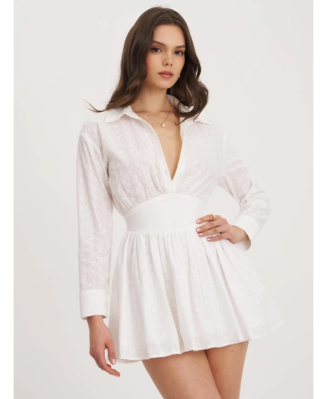 Miss Circle Women's Gabriella White Cotton Eyelet Button Up Long Sleeve Shirt Dress