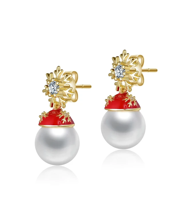 14K Gold Plated with White Pearl & Clear Cubic Zirconia Snowflake and Santa Hat Drop Earrings
