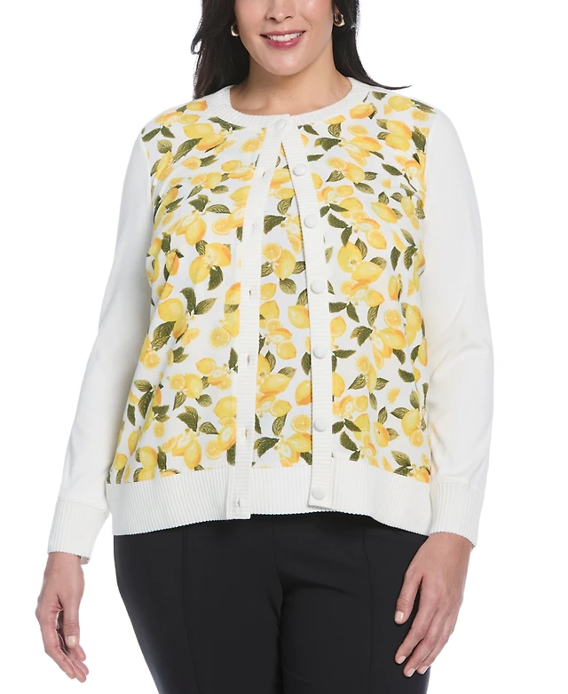 Rafaella Plus Lemon Print Woven Front Long Sleeve Cardigan Sweater