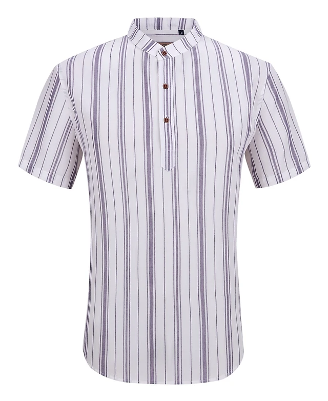 Suslo Couture Men's Linen Stripped Banded Collar Button Up