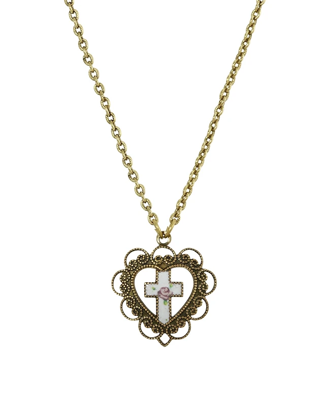 Gold-Tone Heart with White Floral Cross Necklace