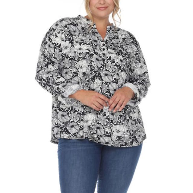 White Mark Plus Pleated Long Sleeve Floral Print Blouse