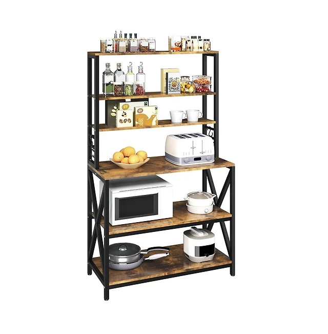 Yaheetech 64.5"H 6-Tier Metal & Particleboard Wine Rack, 10 Hooks, Power Outlets, Adjustable Feet Rustic Baker s Rack