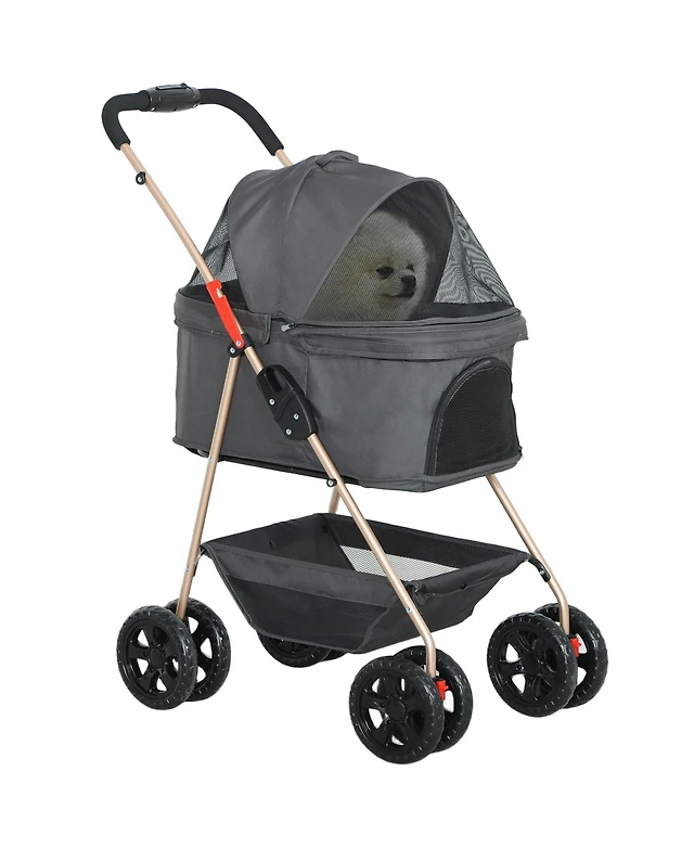 PawHut Pet Stroller for Small and Medium Dogs, 3 Big Wheels Foldable Cat Stroller with Adjustable Canopy, Safety Tether, Storage Basket