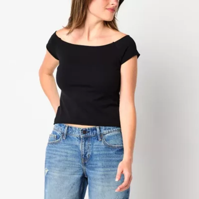 Pumpkin Patch Girlie Off The Shoulder Womens Juniors Round Neck Short Sleeve Fitted Graphic T-Shirt