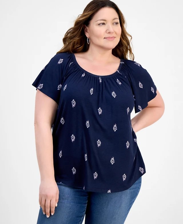 Kasper Plus Tiered Ruffle-Sleeve Printed Blouse