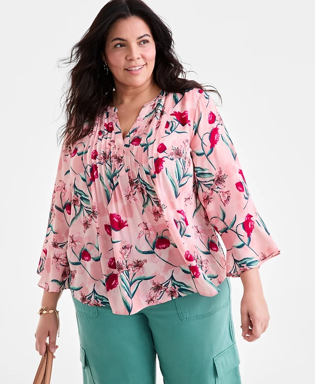I.n.c. International Concepts Plus Printed Pleated V-Neck Blouse, Macy's Exclusive
