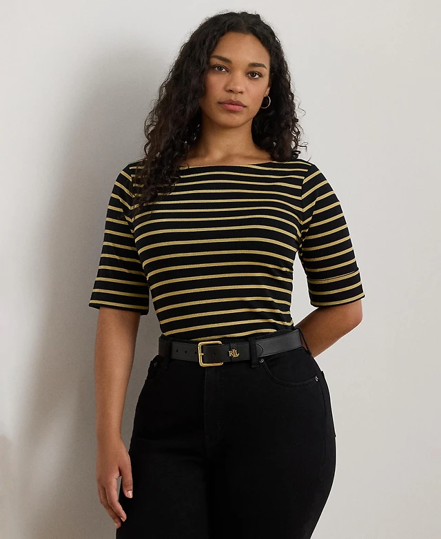 Lauren Ralph Petite Metallic Striped Boat Neck T-Shirt
