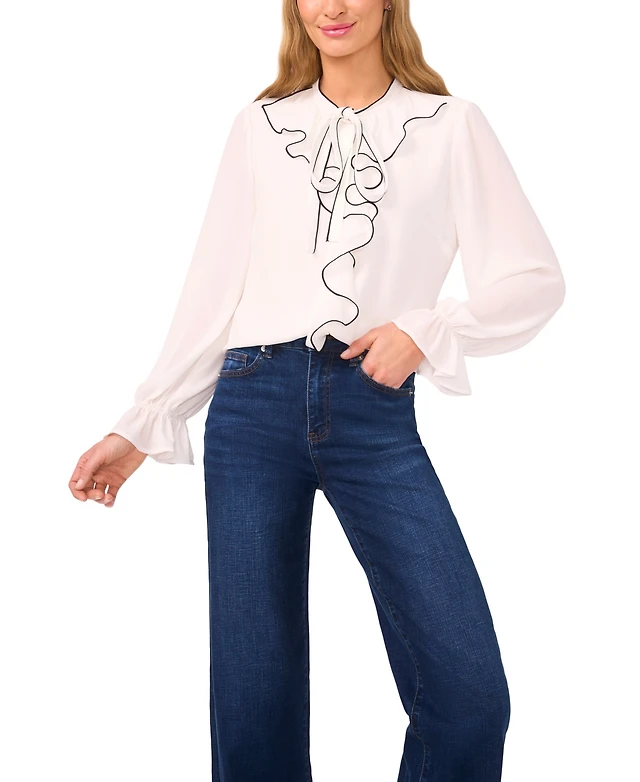 CeCe Women's Long Sleeve Button-Down Ruffle Top