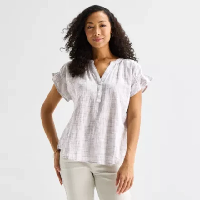 Alfred Dunner Saratoga Springs Womens Keyhole Neck 3/4 Sleeve T-Shirt