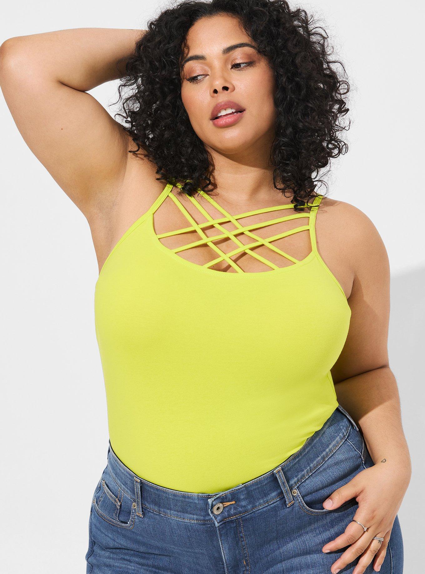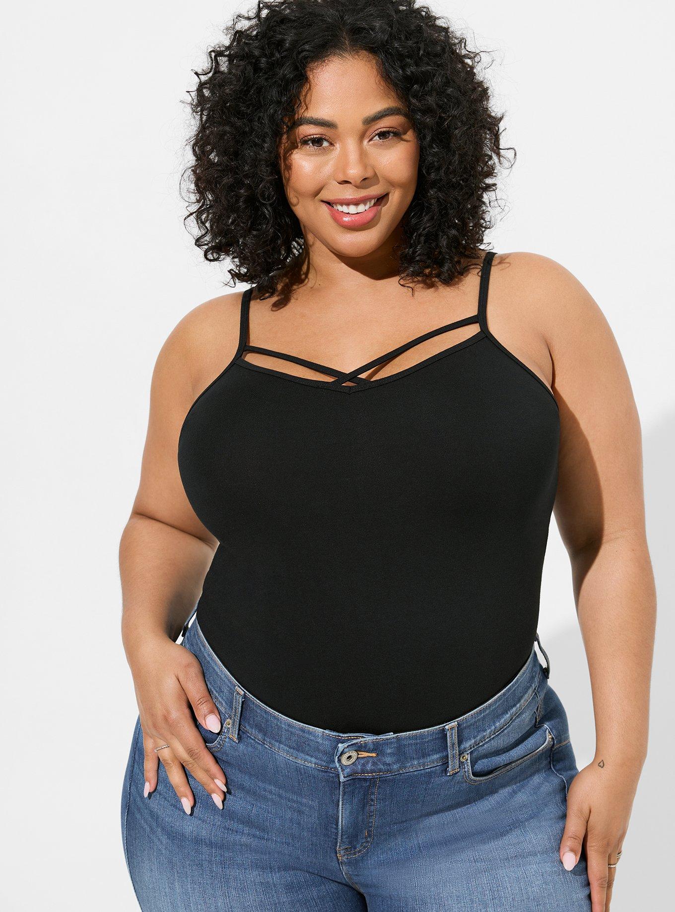 FIT Measures 30" from shoulder (size 2). Adjustable straps. MATERIALS + CARE Foxy knit fabric: Holds you in, smooths you out and doesn't ride up. Stretch level: Maximum. 95% cotton, 5% spandex. Machine wash cold. Tumble dry low. Imported. DETAILS Scoop neckline. Sleeveless. Built-in bra.