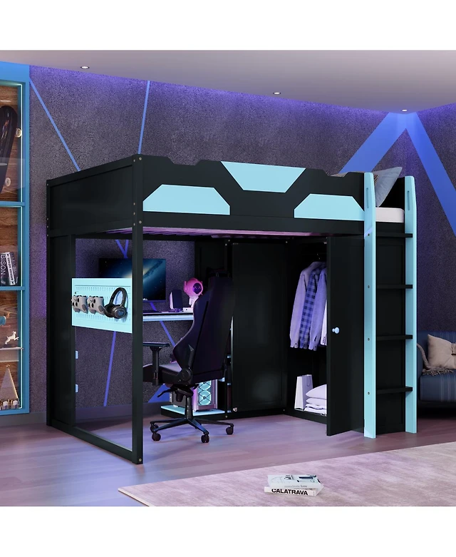 Rainsken Twin Size Metal Platform Bed with Led Light, Upholstered Storage Headboard and Low Profile Design for Kids Boys Girls