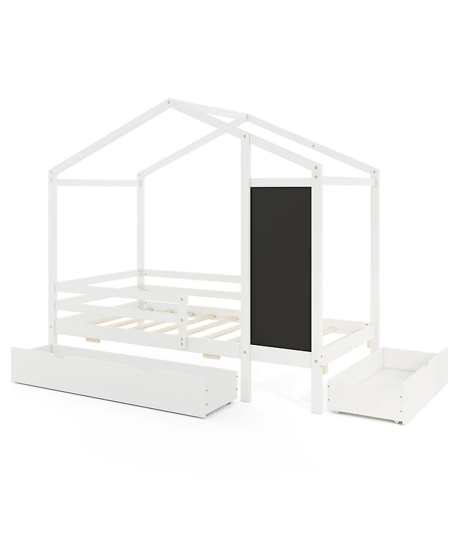 Sugift Twin Wood House Bed Montessori Floor Bed with 2 Shelves and Guardrails