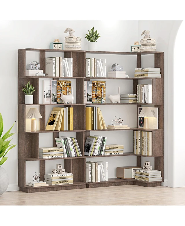 2 Pcs S-shaped Bookshelf Freestanding Stepped Etagere Bookcase with Anti-tipping Kits