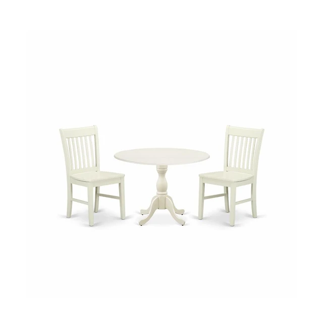 East West Furniture 3 Piece Dining Table Set Consists of 1 Drop Leaves Dining Room Table and 2 Linen White Mid Century Chair with Slatted Back