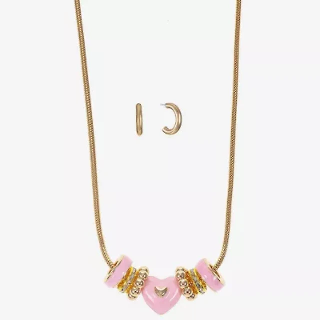 JS Jessica Simpson Gold Tone Collar Necklace & Stud Earring Womens Pink Glass Heart 3-pc. Jewelry Set