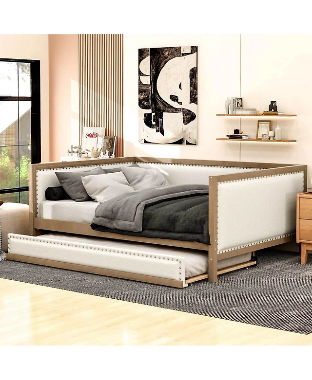 Streamdale Furniture Streamdale Twin Upholstered Daybed with Trundle, Usb, Side Pockets, No Box Spring Needed (Beige