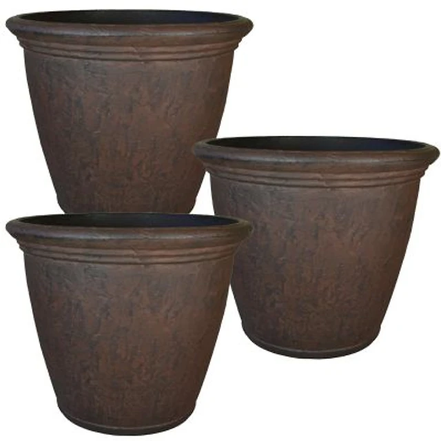 Indoor/Outdoor Round Ribbed Polyresin Planter Pot with Double Wall Design - Rust