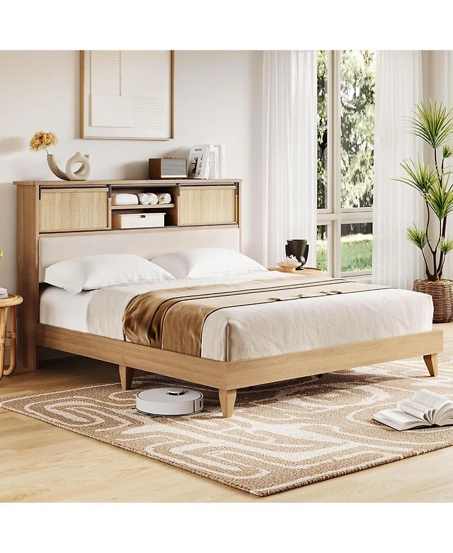 gaomon Queen Size Bed Frame with Natural Rattan Headboard & Integrated Led Lights
