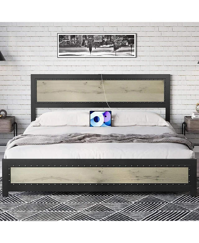 Gaomon Bed Frame Charging Station With 2 Usb Ports 2 Ac Outlets Heavy Duty Metal Bed Frame With Wooden Headboard Footboard Rustic