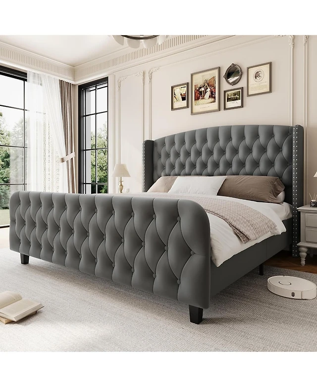 Gaomon King Upholstered Platform Bed Wingback Headboard Velvet 2 Storage Pockets Wooden Slat Support Box Spring Optional Light