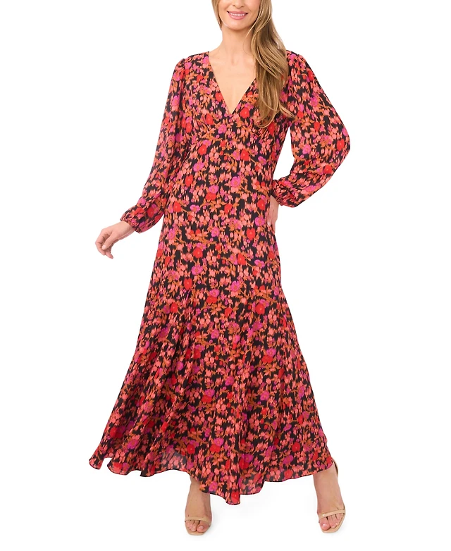 CeCe Women's Smocked Waist V-Neck Maxi Dress