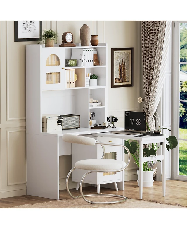 Skonyon L-Shaped Desk Corner Computer Desk with Open Storage Hutch and Cabinet-White