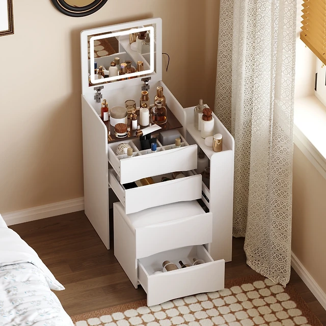 Corner Vanity Desk Cosmetic Vanity Station with Led Mirror,& Power Outlets