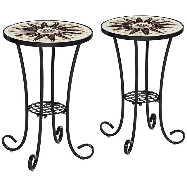 Teal Island Designs Rustic Black Round Outdoor Accent Side Tables 14" Wide Set of 2 Brown Mosaic Tabletop for Front Porch Patio Home House