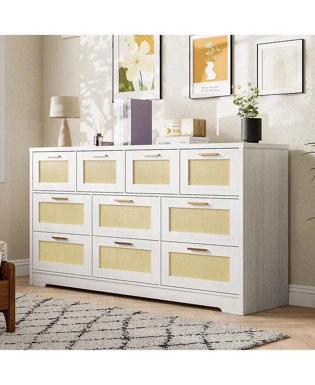 Gaomon Coffee Brown Rattan 6-Drawer Dresser, Oak Storage Cabinet for Bedroom