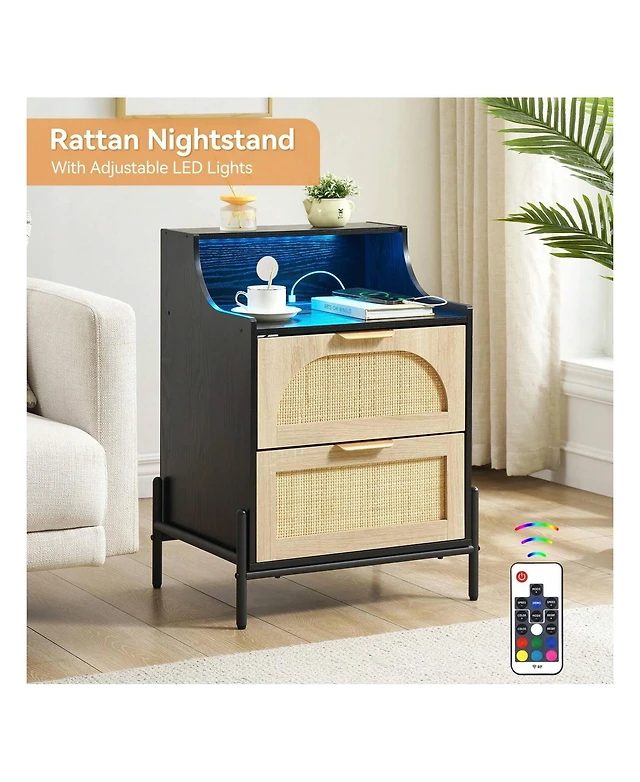 Simplie Fun Rattan End Table With Power Outlet & Usb Ports, Modern Nightstand With Drawer And Solid Wood