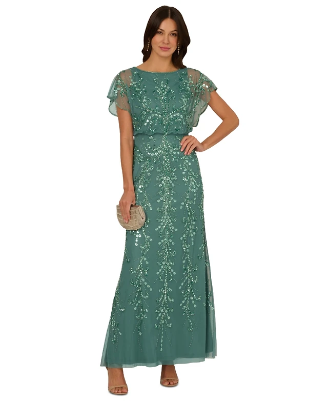 Adrianna Papell Women's Beaded Mesh Flutter-Sleeve Gown