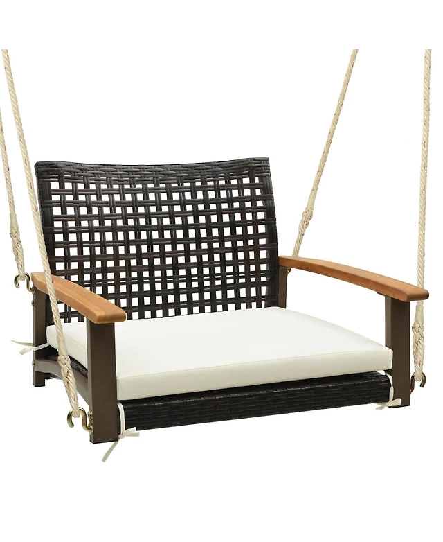 Single Rattan Porch Swing with Armrests Cushion and Hanging Ropes
