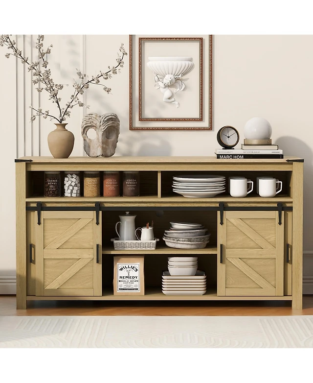 gaomon 55 Inch Buffet Storage Cabinet with Four Doors Adjustable Shelves and Metal Handles Modern Farmhouse Style
