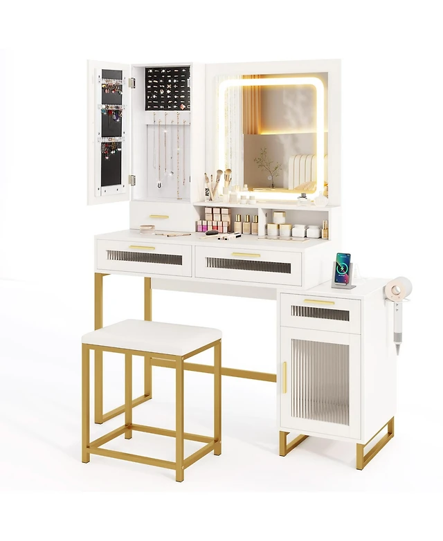 Homfan Corner Vanity, Vanity Desk with Mirror and Lights, Fluted Makeup Table Charging Station, Drawers, Storage Cabinets