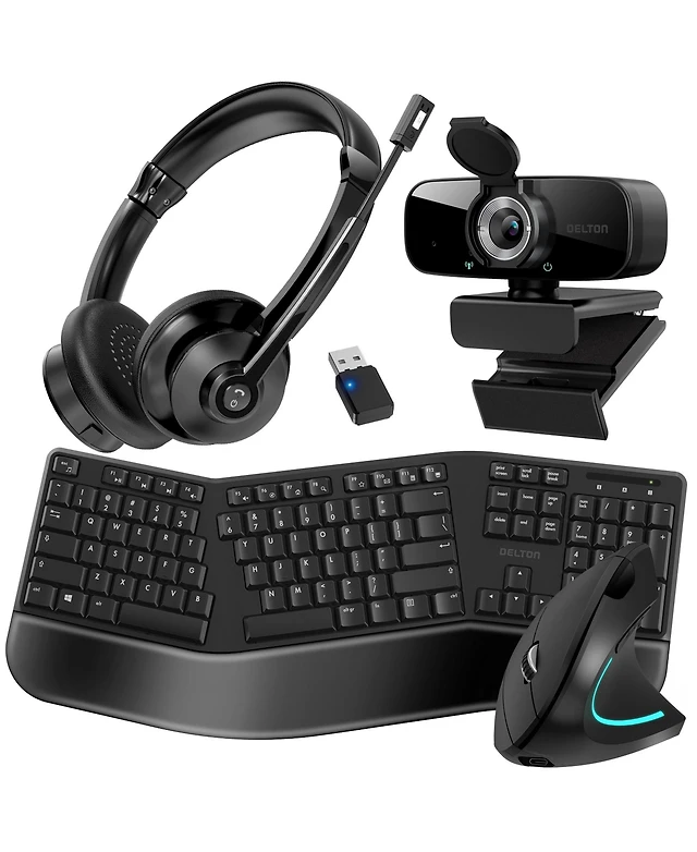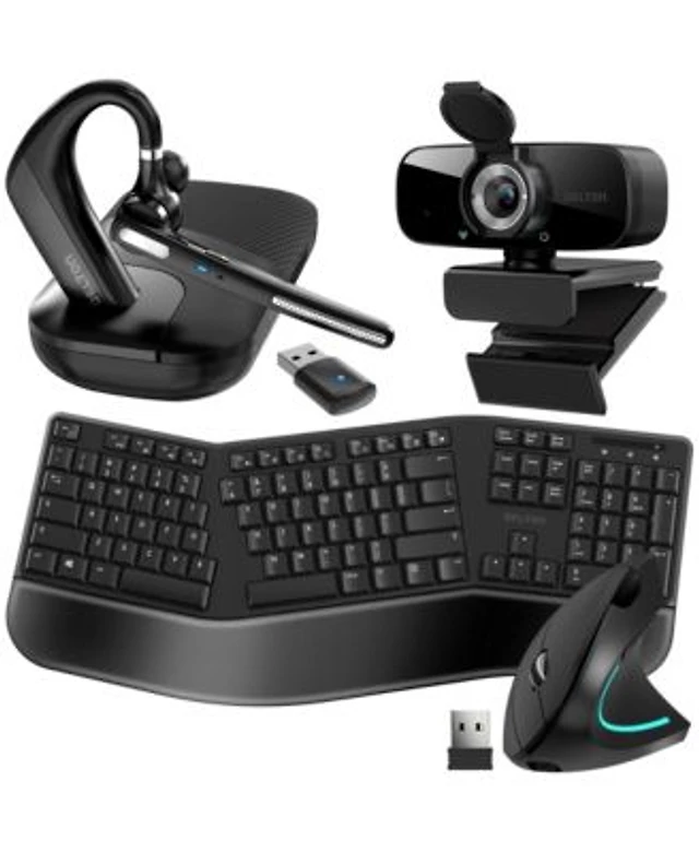 Delton KB200 Ergonomic Wireless Keyboard & S12 Vertical Mouse , 1080p Usb Webcam with Adjustable Mounting Clip, Bluetooth Headset with Usb Dongle, Com