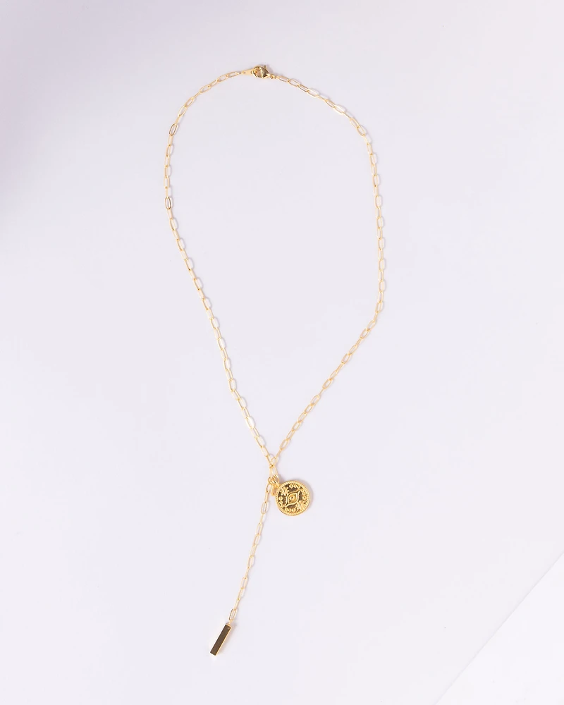 Bring a celestial touch to your jewelry box with this stunning 16K gold-plated Y-necklace, featuring a beautifully detailed celestial coin and a sleek bar drop. It’s the ultimate piece that guides your look from day to night with a perfectly sophisticated glow!