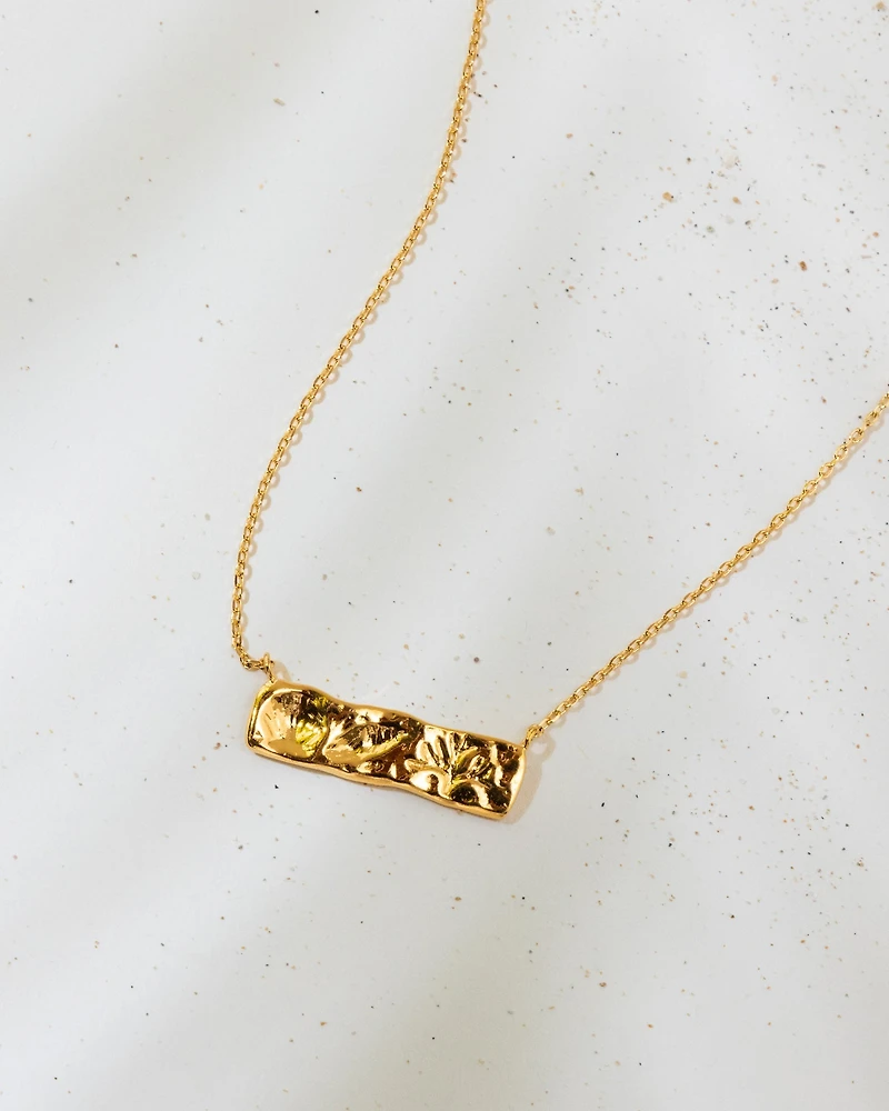 Sleek and symbolic, this gold-toned pendant necklace features a horizontal bar engraved with a delicate trio of imprints for a subtle statement. Minimal yet meaningful, it’s the perfect everyday piece that adds a touch of shine and personality to any look.