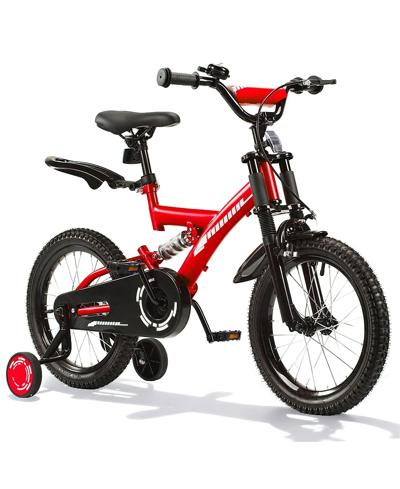 Make your child's first riding experience safe and fun with this 16-inch kids bike. Arriving 85% pre-assembled, it's beginner-friendly for parents to set up in about 20 minutes. Built with a durable carbon steel frame, dual suspension, and single-speed design, it offers stability and low maintenance for everyday use. Detachable training wheels, a quick-release seat, and both coaster and hand brakes give young riders confidence and control as they learn. Safety details like a handlebar bell and fully enclosed chain guard protect kids during rides. Suitable for ages 4–7, this bicycle is perfect for parks, driveways, or backyards, making it a thoughtful gift for birthdays or holidays.