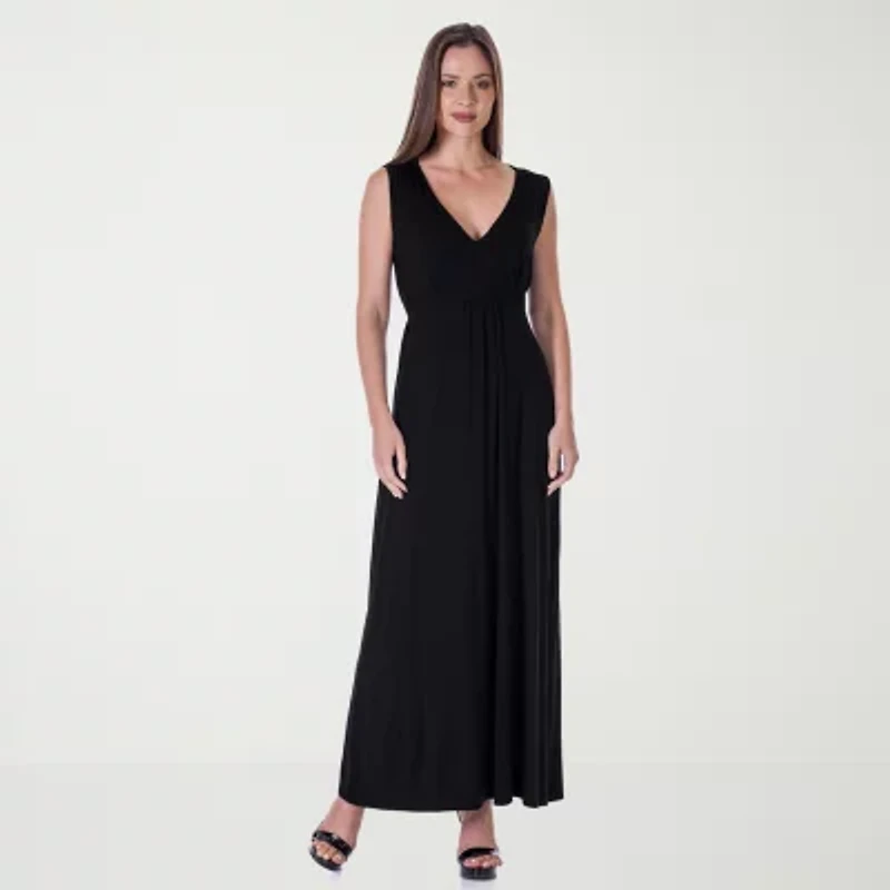 This sleeveless maxi dress from 24seven Comfort Apparel brings together fun, elegance, and effortless versatility for warm weather style. Crafted from soft, comfortable stretch knit fabric, it drapes beautifully while remaining machine washable and tumble dry for easy care. The Grecian inspired V neck, figure flattering empire waistline, and adjustable attached belt create a polished yet relaxed silhouette. Style it with flat sandals for daytime events or elevate the look with heels and bold accessories for evenings out.