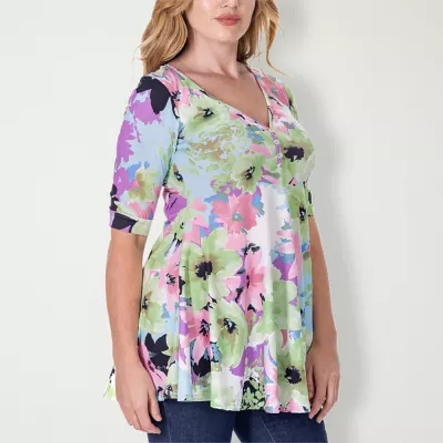 24seven Comfort Apparel Plus Womens V Neck Elbow Sleeve Tunic Top