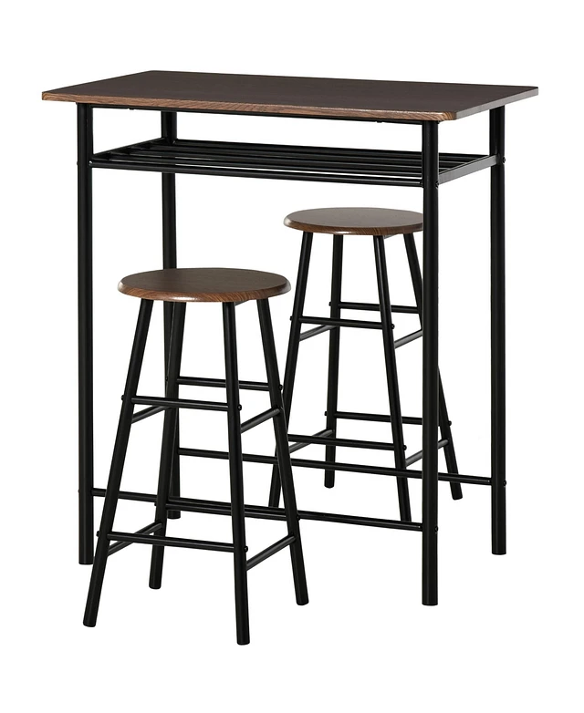 3 Piece Counter Height Bar Table and Chairs Set, Space Saving Dining Table with 2 Matching Stools, Storage Shelf Metal Frame Footrest, Black, Brown