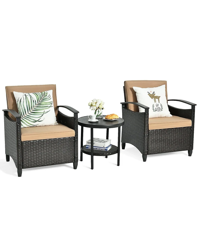 3 Pieces Patio Rattan Furniture Set Cushioned Sofa Storage Table with Shelf Garden