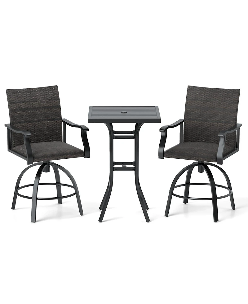 This patio swivel bar set offers comfort, convenience, and style with its padded seats, sturdy aluminum frame, and high-quality hand-woven Pe wicker. Featuring 360° swivel stools and a convenient umbrella hole, it's perfect for outdoor relaxation and entertaining. The set includes 2 swivel chairs and a bar table, ideal for various outdoor settings.