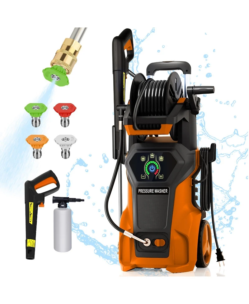 Tackle tough grime with the Skonyon 3500 Psi pressure washer. Its 1800W motor, 2.8 Gpm flow, and touchscreen with 3 pressure levels make cleaning easy. Includes 4 nozzles, soap bottle, wheels, Tss, and built-in storage for convenient outdoor use.