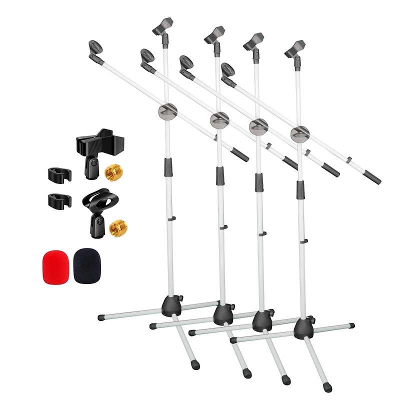FeaturesStable Tripod Base - The heavy-duty tripod leg design has an anti-slip design. It offers better weight capacity and won't wobble or fall during performance.Dual Mic Stand - This is a dual standing mic stand. It can hold 2 microphones at once. Making it perfect for those who sing and play instruments.Wire Management - The mic stand comes with two wire clips. They keep your setup neat and clean. Eliminate the accidental tangles or trip hazard.Wide Application - The heavy-duty boom mic stand floor is perfect for on-stage and studio use, meeting rooms, karaoke singing, speeches, and band performances.Tripod Mic Stand Product specification:Folded size - About 31.5 inchMaximum Height - 76 InchesMinimum Height - 31 inchesBoom arm length - 30 inchesMaterial: Metal, plastic, steel, ABSCompatible Thread - to AdapterPackage includes:4x Microphone Stand8x Mic Holders8x Wire Clips8x Screw Adapter8x Mic Windscreen