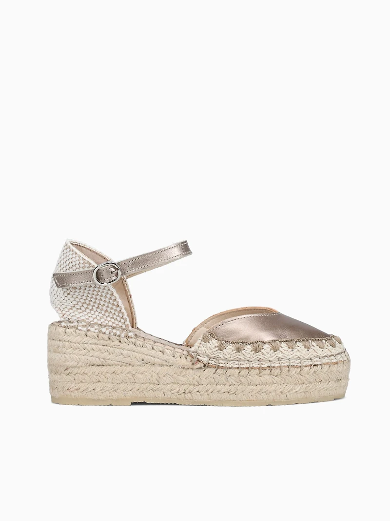 Elevate your summer style with these handcrafted wedge espadrilles made in Spain. Designed with soft metallic leather, a classic closed toe, and a natural braided jute platform, they offer lightweight height and all-day comfort. The adjustable ankle strap ensures a secure, flattering fit, while hand-stitched details reflect authentic Spanish craftsmanship.