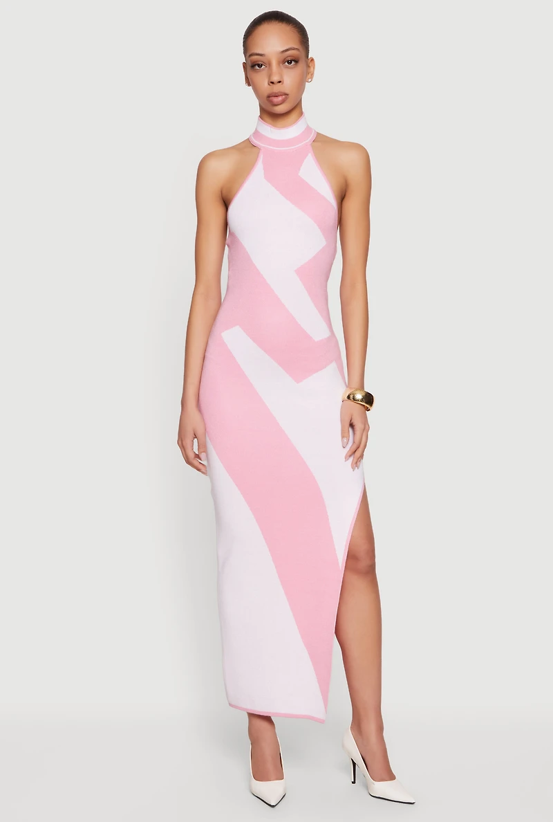 Abstract Print Side Slit Halter Maxi Dress