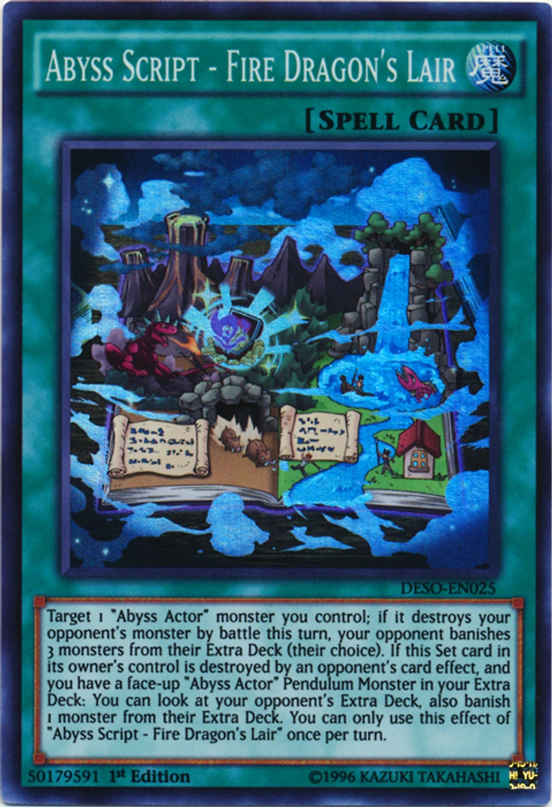 Passcode: 50179591 Card Number: DESO-EN025 Rarity: Super Rare Card Text: Target 1 "Abyss Actor" monster you control; if it destroys your opponent's monster by battle this turn , your opponent banishes 3 monsters from their Extra Deck (their choice). If this Set card in its owner's control is destroyed by an opponent's card effect and you have a face-up "Abyss Actor" Pendulum Monster in your Extra Deck: You can look at your opponent's Extra Deck also banish 1 monster from their Extra Deck. You can only use this effect of "Abyss Script - Fire Dragon's Lair" once per turn. Card Type: Spell Card Name: Abyss Script - Fire Dragon's Lair Edition: 1st
