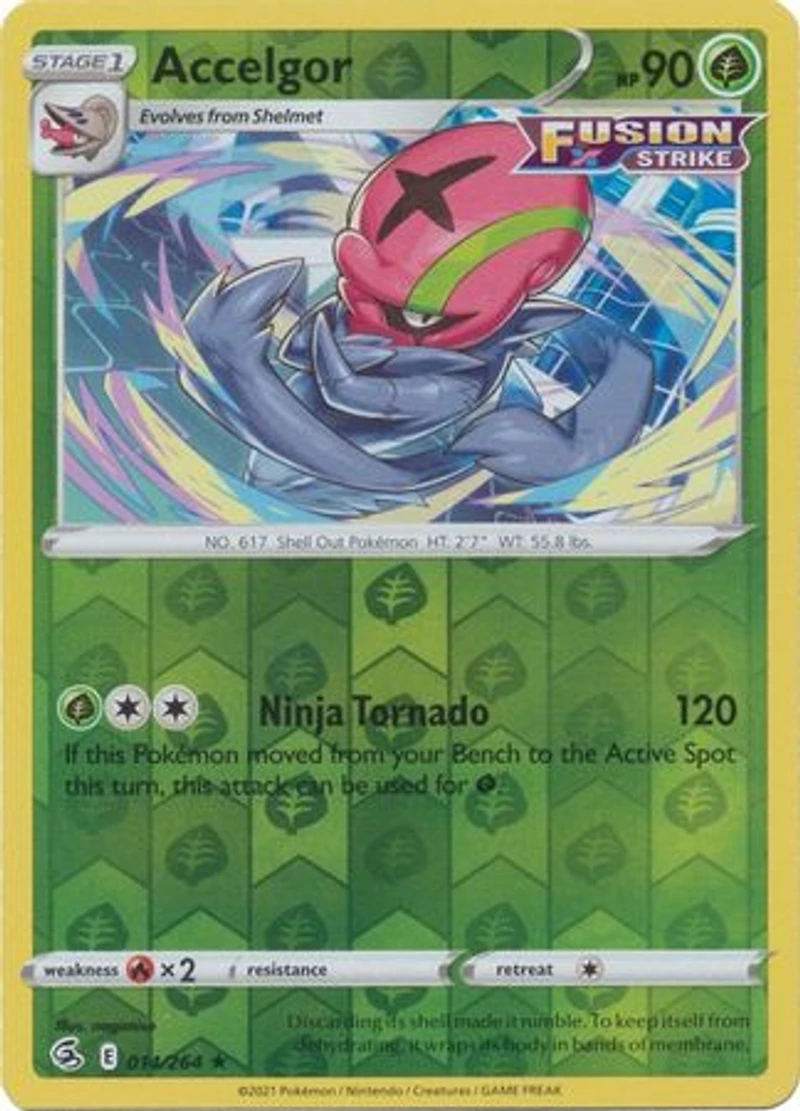 Set: Fusion Strike Card Number: 014/264 Rarity: Rare Retreat Cost: 1 Weakness: Fire HP: 90 Stage: Stage 1 Card Type: Grass Name: Accelgor Finish: Reverse Holo Attack #1: [2G] Ninja Tornado (120) If this Pokemon moved from your bench to the Active Spot this turn , this attack can be used for G. Manufacturer: The Pokemon Company